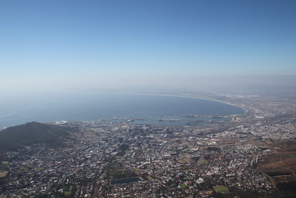 桌山最令人惊奇的地方,在于一座海拔一千米的高山,山顶却平展恰似一个巨大的桌面,开阔无比,从山顶往下看,整个开普敦的市容一览无遗,景色绝佳。往北面的远处看,依稀可见是我们住的酒店,以及繁华商业区Waterfront。