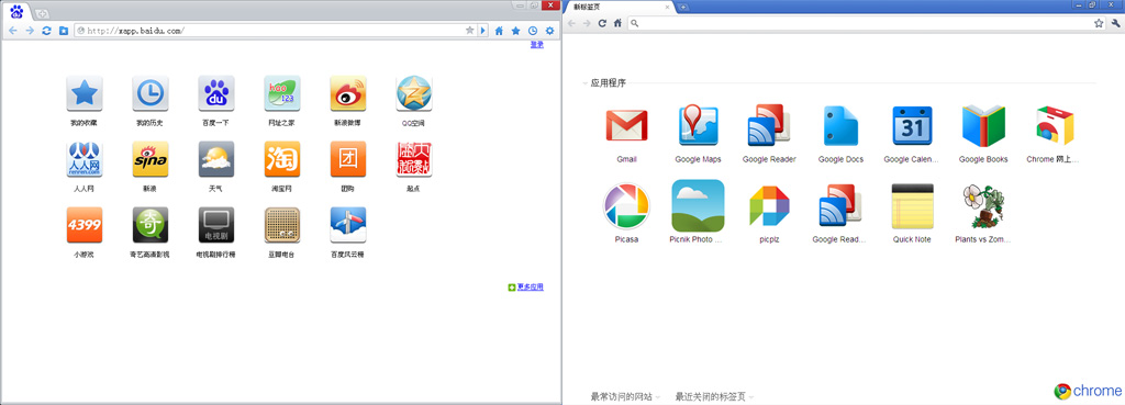 百度浏览器新建页签的界面也明显抄袭了谷歌Chrome浏览器,从外观、界面、甚至图标按钮都和谷歌Chrome浏览器一模一样。
